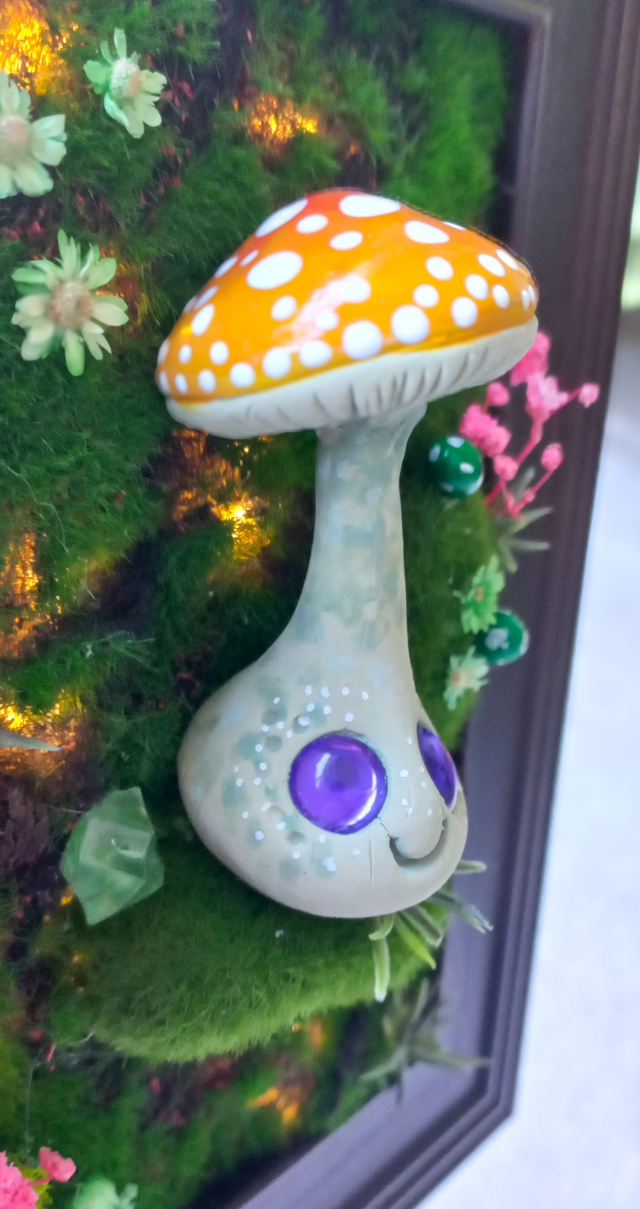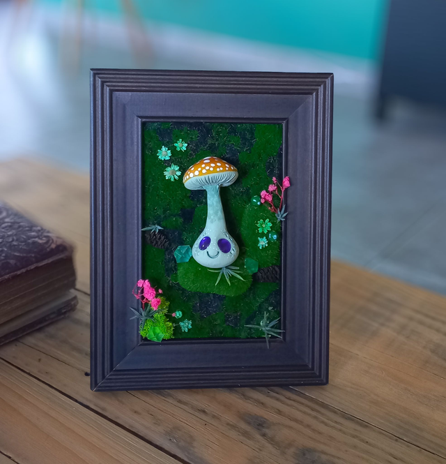 Une belle amanite orangée dans son milieu naturel au centre d’un cadre végétalisé. Cette petite créature magique a été entièrement modelée et peinte à la main. Chaque cadre est unique, pensé pour apporter une touche de magie à votre intérieur.