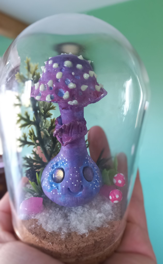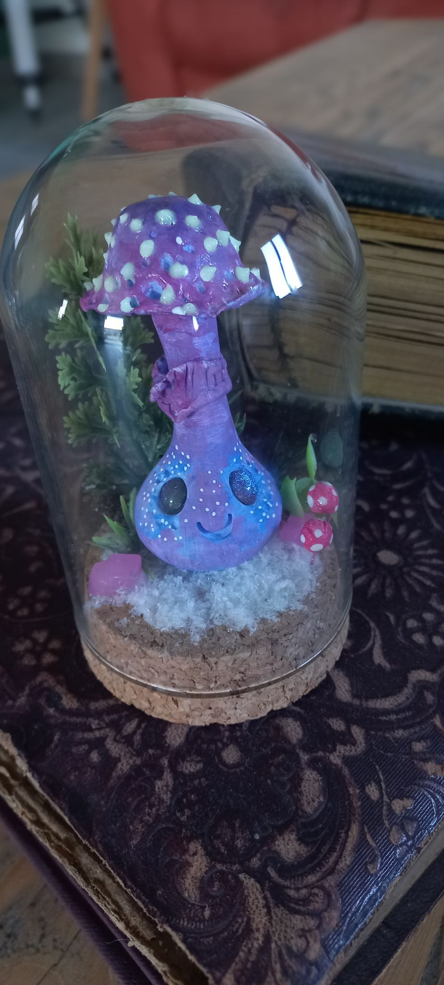 Petit trésor de la nature, le Laccaire Améthyste est un champignon doux et mystérieux. Sous sa cloche en verre, il est entouré d’une délicate neige, de végétation et de petits champignons roses. Sur son chapeau, des points phosphorescents ajoutent une touche magique, et ses teintes confèrent une aura douce et enchantée. Il est entièrement modelé et peint à la main.